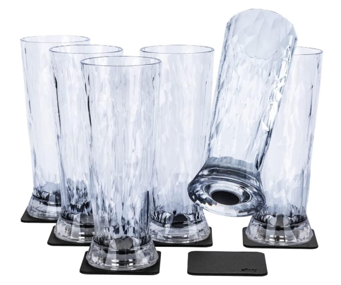 Set van 6 magnetische bier glazen met zwarte metalen Nano-Gel onderzetters.